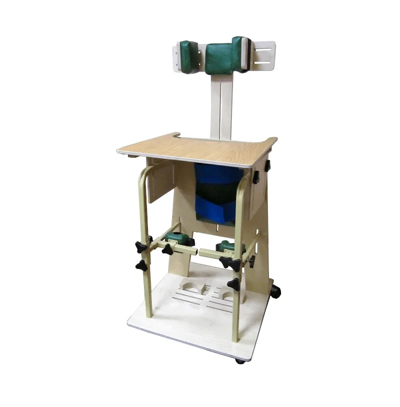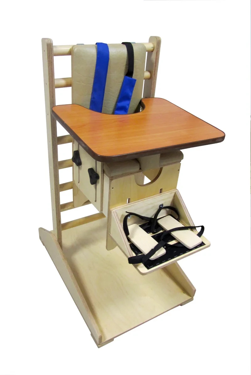 Грудная часть тела фиксируется креплением «уздечка», а тазобедренная - набедренным креплением. При гиперкинезе у ребенка устанавливаются дополнительные приспособления на столешнице, например вертикальные или горизонтальные ручки, прорези для фиксации одной руки, а также дополнительные петли к подножке для более жесткой фиксации голеностопных суставов.