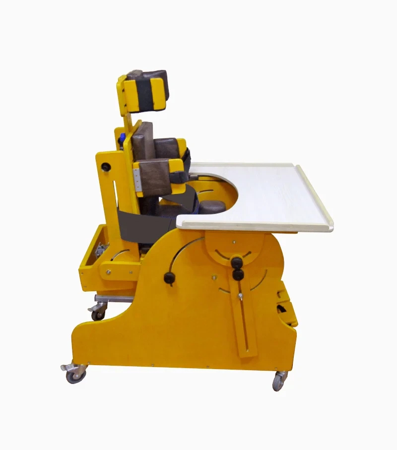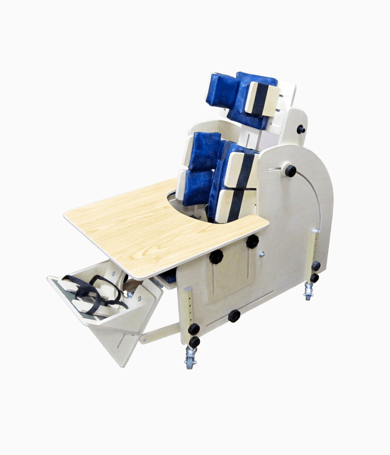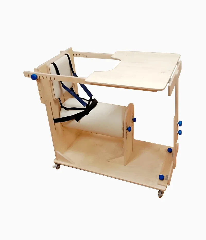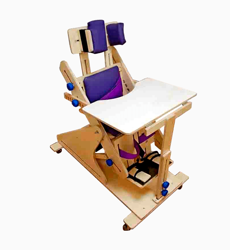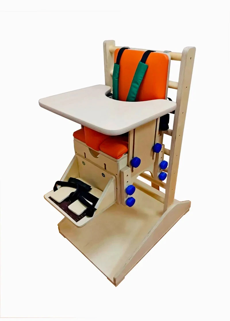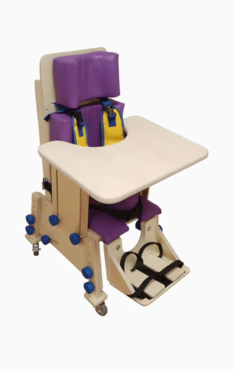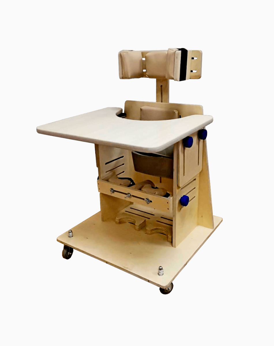 Описание: Создаёт правильное, симметричное положение за счёт изменяемых по высоте ножек и подлокотников, встроенного или съемного корсета с металлическими планшетками абдуктора. Опора снабжена столиком для дополнительной опоры рук и развития мелкой моторики. Ножки сидения и подлокотники регулируются по высоте. При гиперкинезах у ребенка устанавливаются дополнительные приспособления на столешнице, например, вертикальные или горизонтальные ручки, прорези для фиксации одной руки, а также дополнительные петли к подножке для более жесткой фиксации голеностопных суставов. Столик может быть выдвижной. Опора может иметь подголовники 2-х типов (мягкий или жесткий). Угол между сидением и подножкой меняется от 90° до 135°. Угол наклона спинки меняется от 0° до 30° от вертикали. Опора установлена на колесах, задняя пара колес имеет тормоза.
