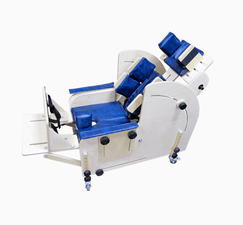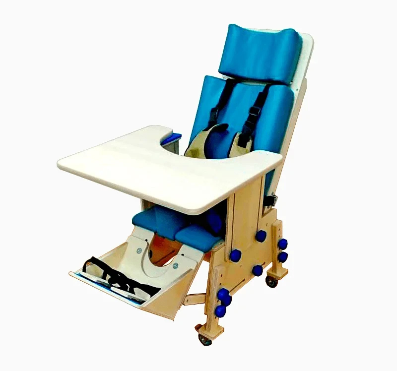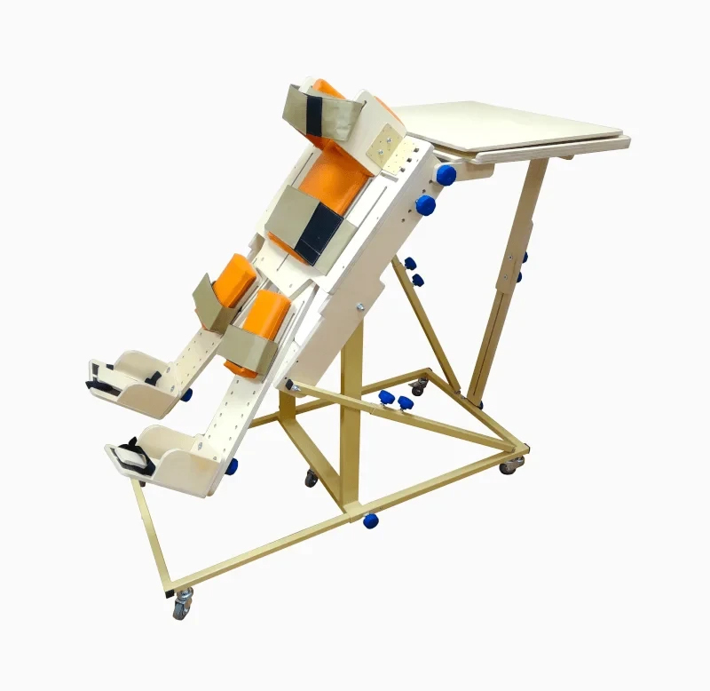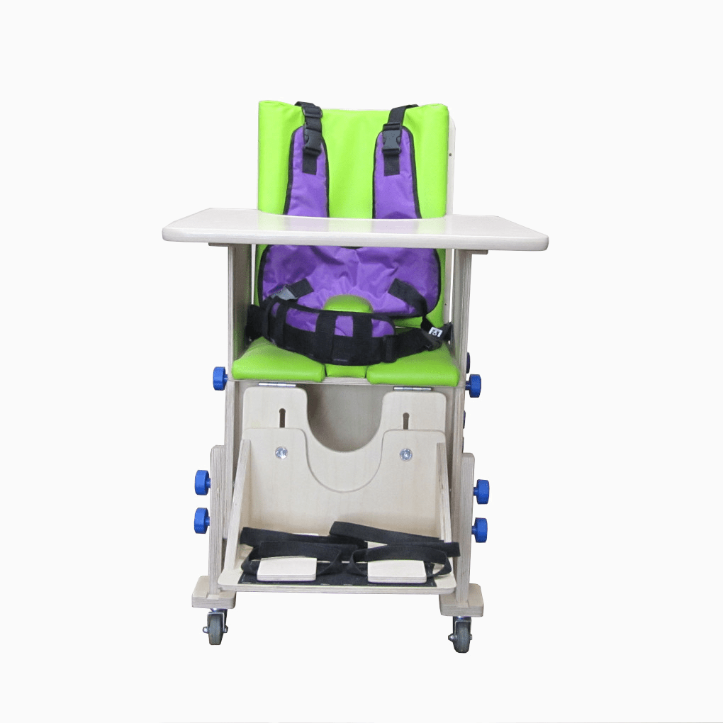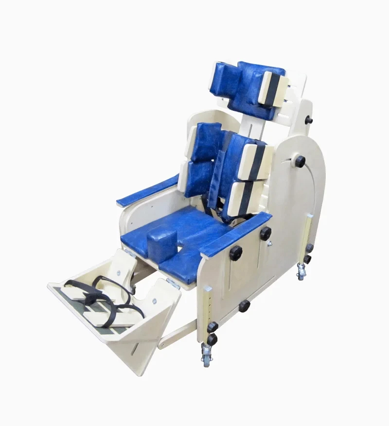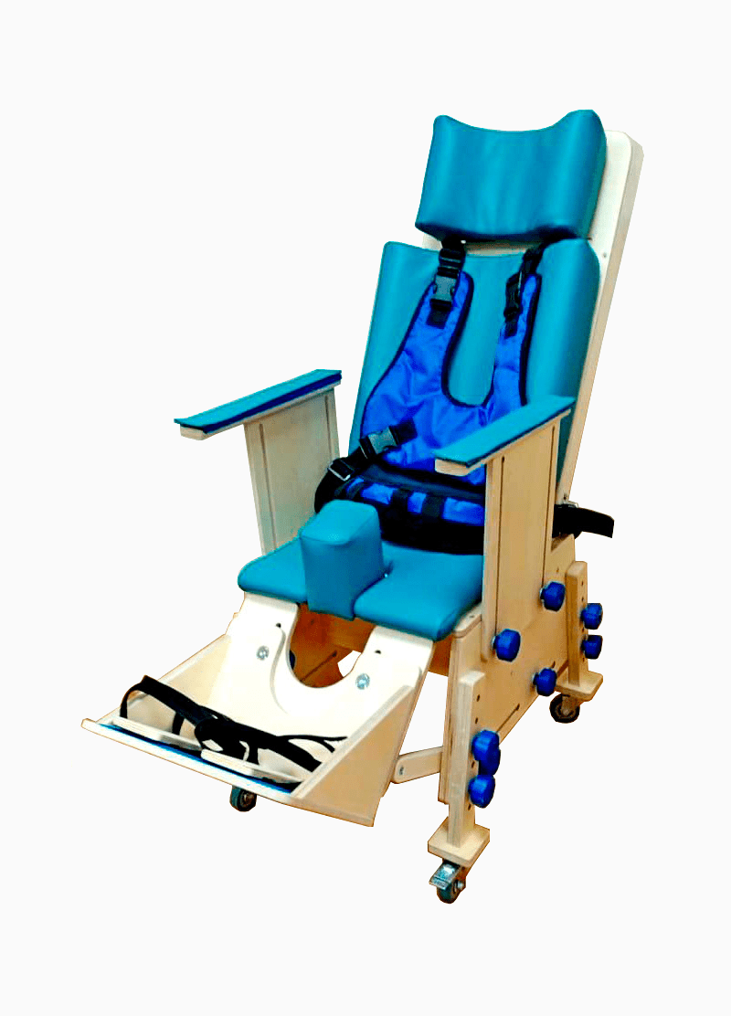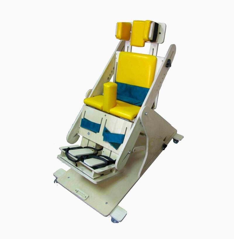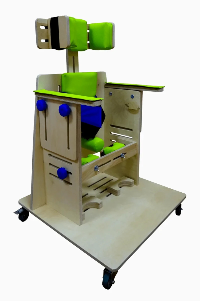 Описание: Создаёт правильное, симметричное положение за счёт изменяемых по высоте ножек и подлокотников, встроенного или съемного корсета с металлическими планшетками абдуктора. Опора снабжена столиком для дополнительной опоры рук и развития мелкой моторики. Ножки сидения и подлокотники регулируются по высоте. При гиперкинезах у ребенка устанавливаются дополнительные приспособления на столешнице, например, вертикальные или горизонтальные ручки, прорези для фиксации одной руки, а также дополнительные петли к подножке для более жесткой фиксации голеностопных суставов. Столик может быть выдвижной. Опора может иметь подголовники 2-х типов (мягкий или жесткий). Угол между сидением и подножкой меняется от 90° до 135°. Угол наклона спинки меняется от 0° до 30° от вертикали. Опора установлена на колесах, задняя пара колес имеет тормоза.