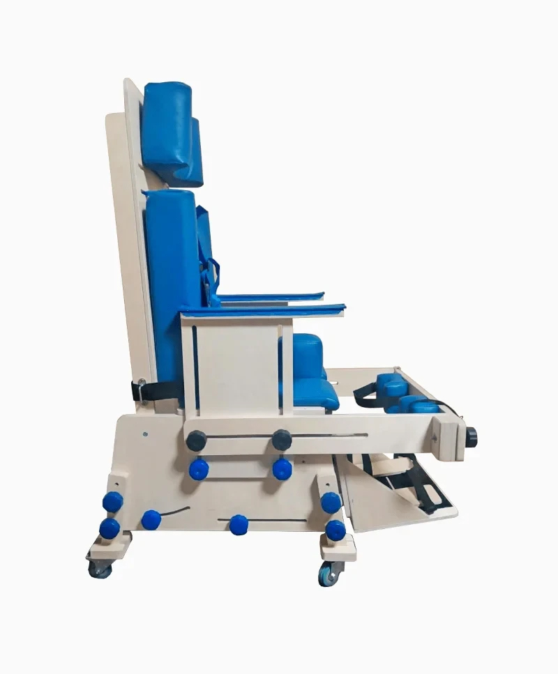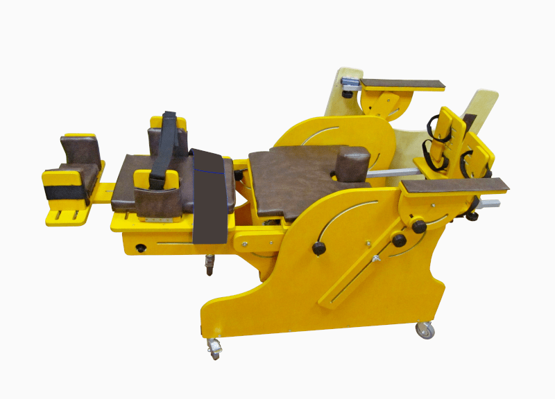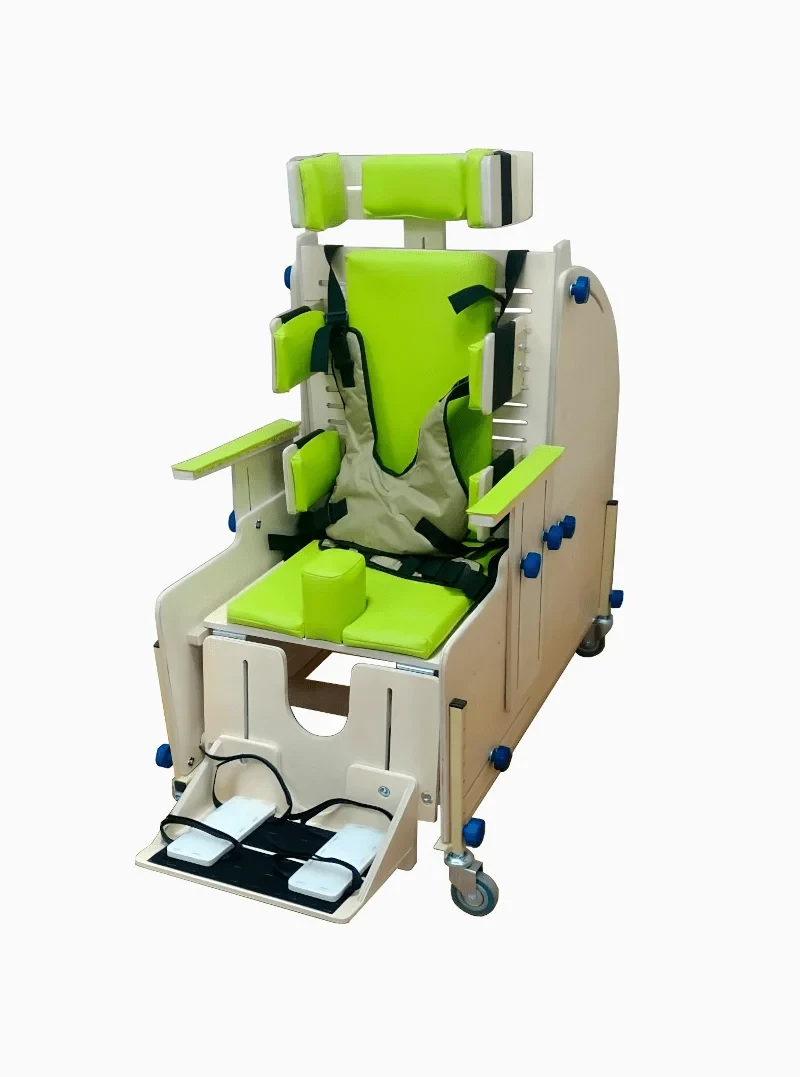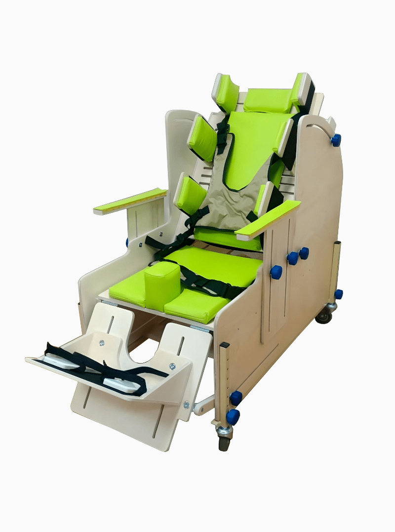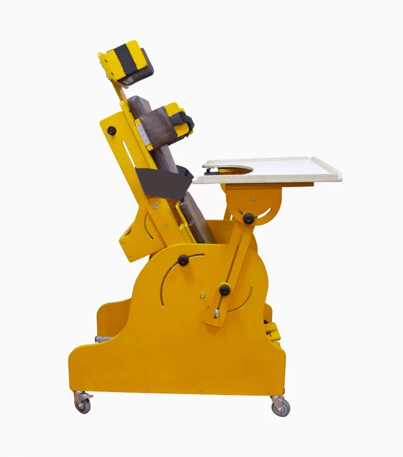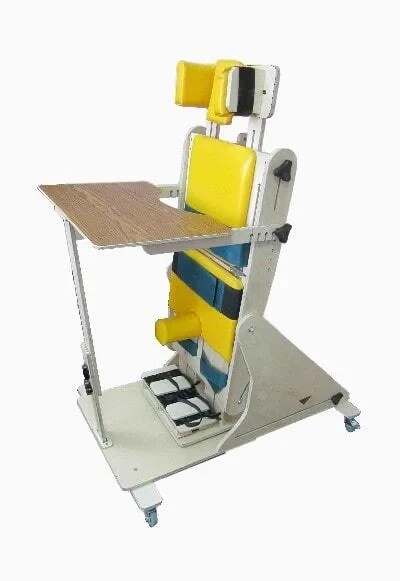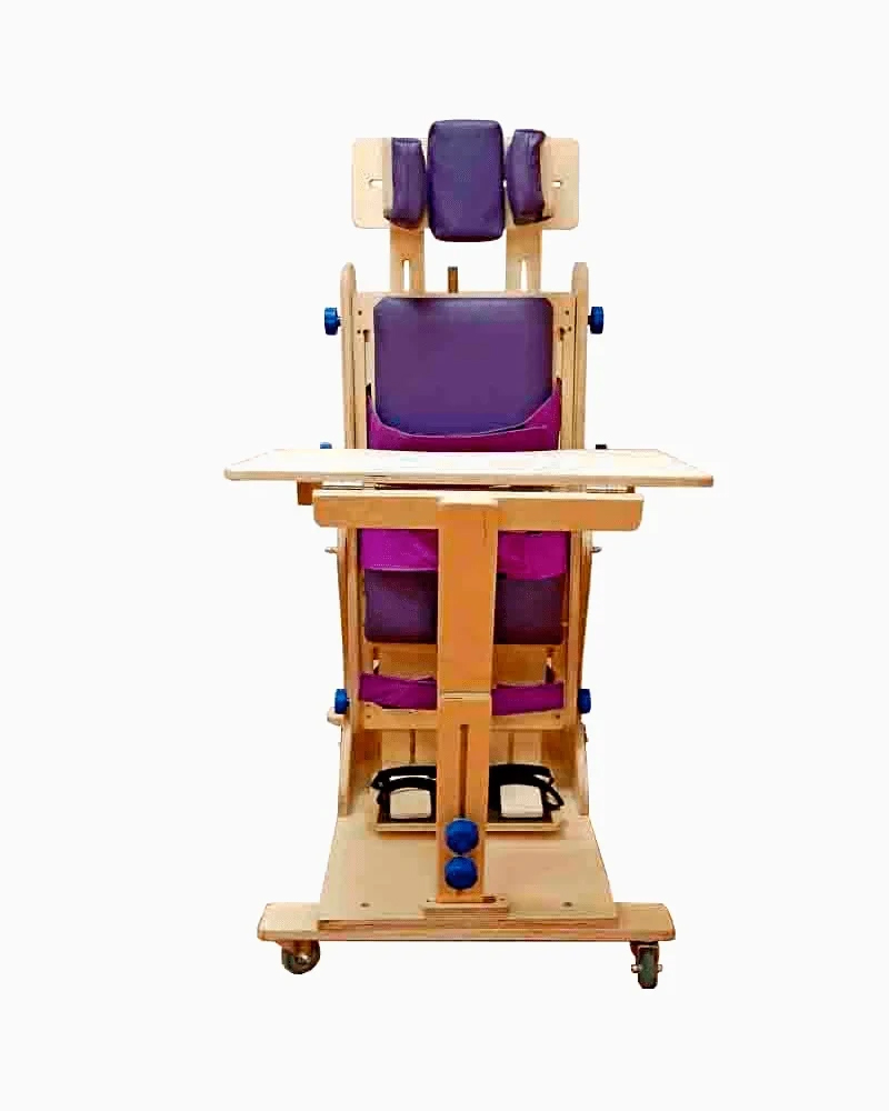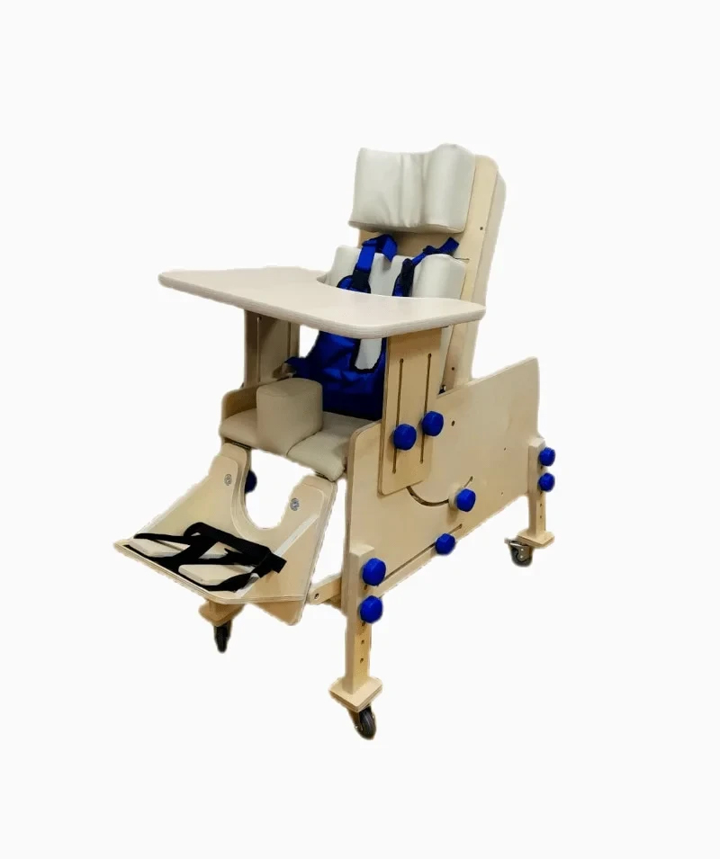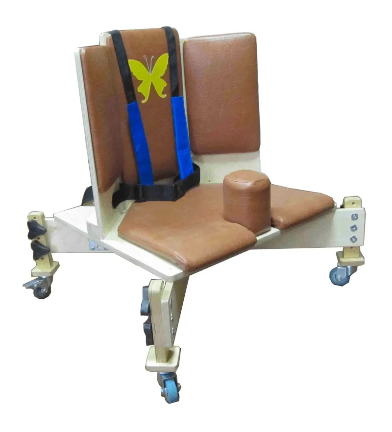 Описание: Создаёт правильное, симметричное положение за счёт изменяемых по высоте ножек и подлокотников, встроенного или съемного корсета с металлическими планшетками абдуктора. Опора снабжена столиком для дополнительной опоры рук и развития мелкой моторики. Ножки сидения и подлокотники регулируются по высоте. При гиперкинезах у ребенка устанавливаются дополнительные приспособления на столешнице, например, вертикальные или горизонтальные ручки, прорези для фиксации одной руки, а также дополнительные петли к подножке для более жесткой фиксации голеностопных суставов. Столик может быть выдвижной. Опора может иметь подголовники 2-х типов (мягкий или жесткий). Угол между сидением и подножкой меняется от 90° до 135°. Угол наклона спинки меняется от 0° до 30° от вертикали. Опора установлена на колесах, задняя пара колес имеет тормоза.
