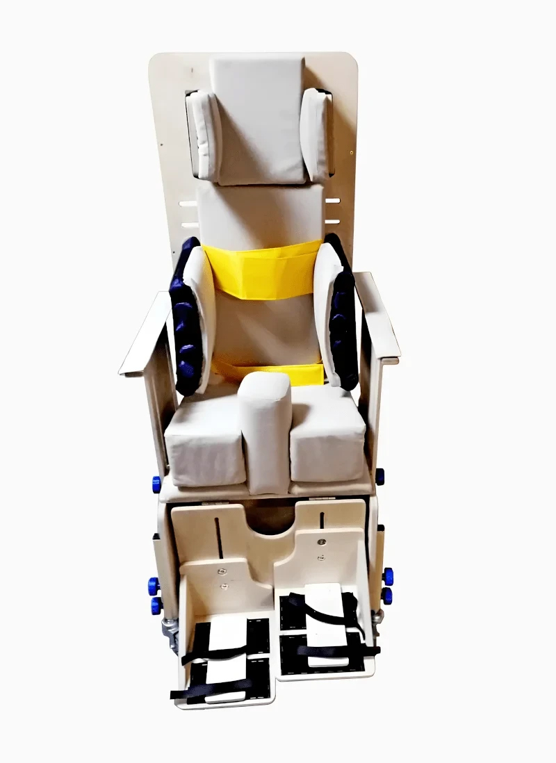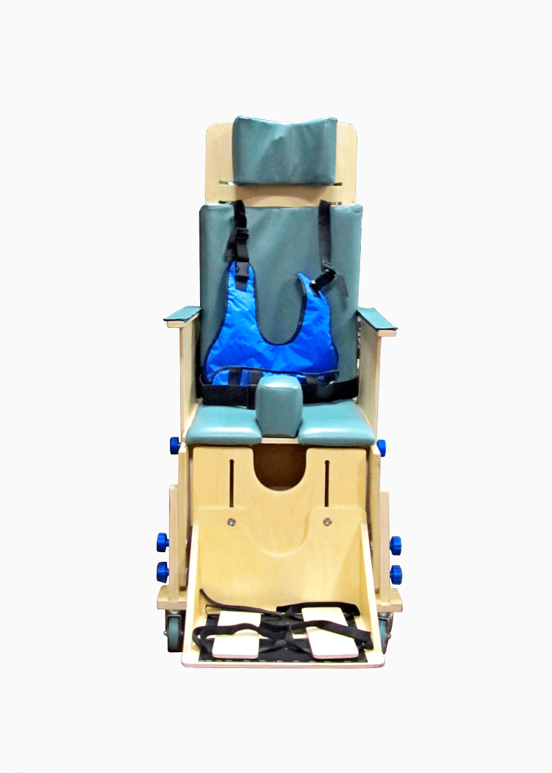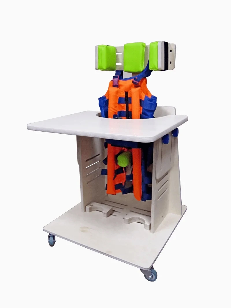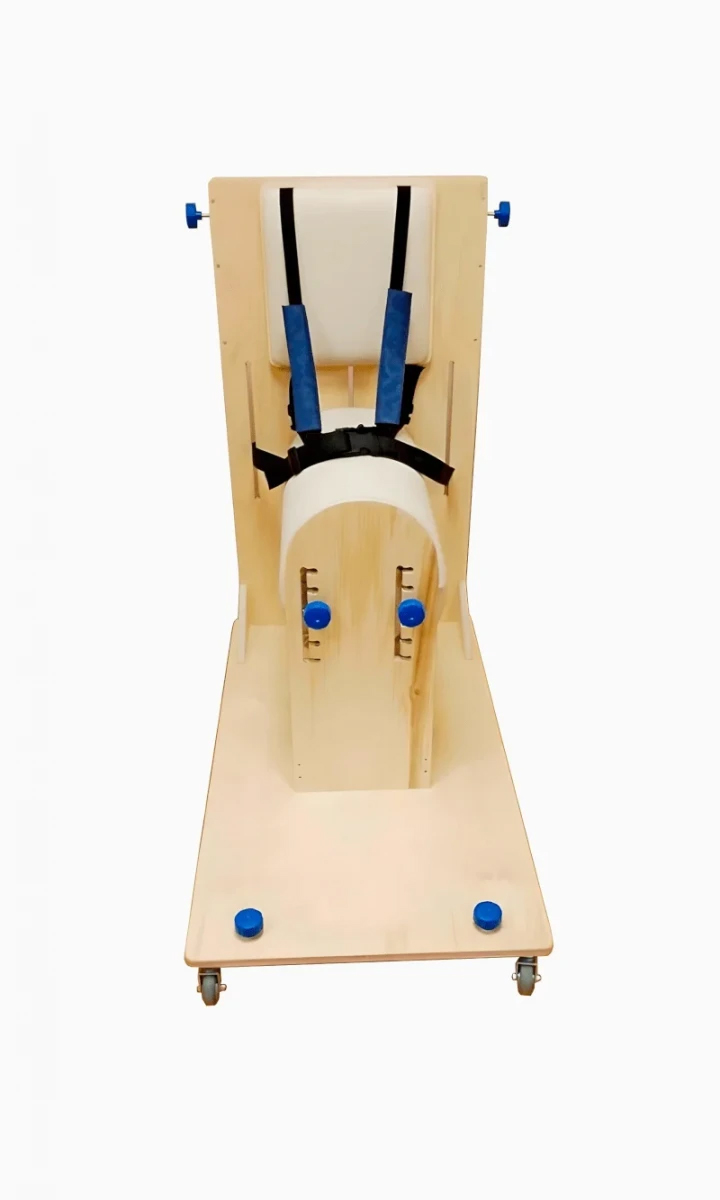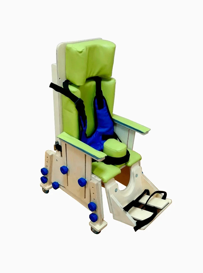 Опора может изготавливаться с анатомической спинкой, подголовником и жилетом для детей с ослабленными мышцами спины, сколиозом, нарушением осанки и отсутствие контроля положения торса.