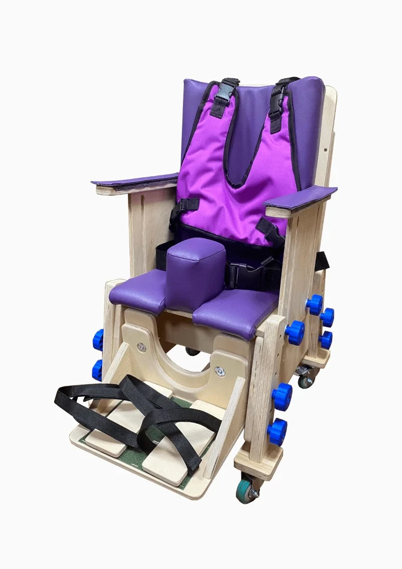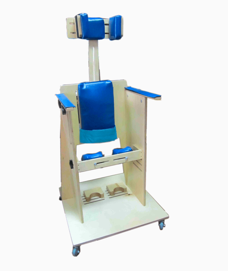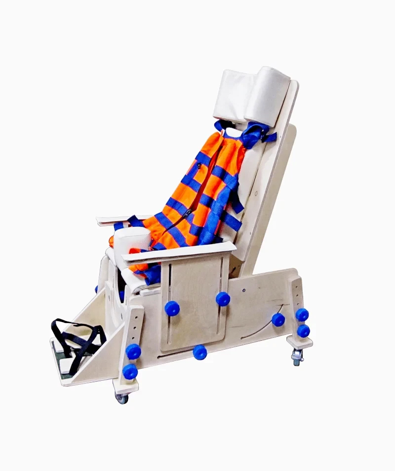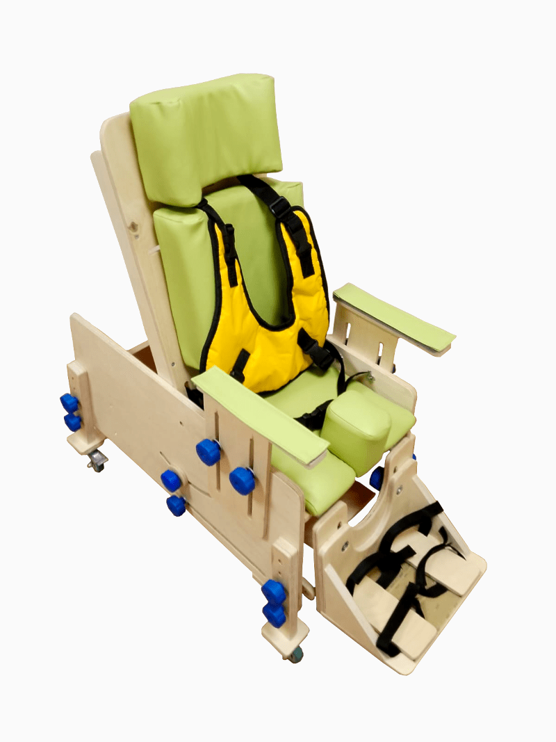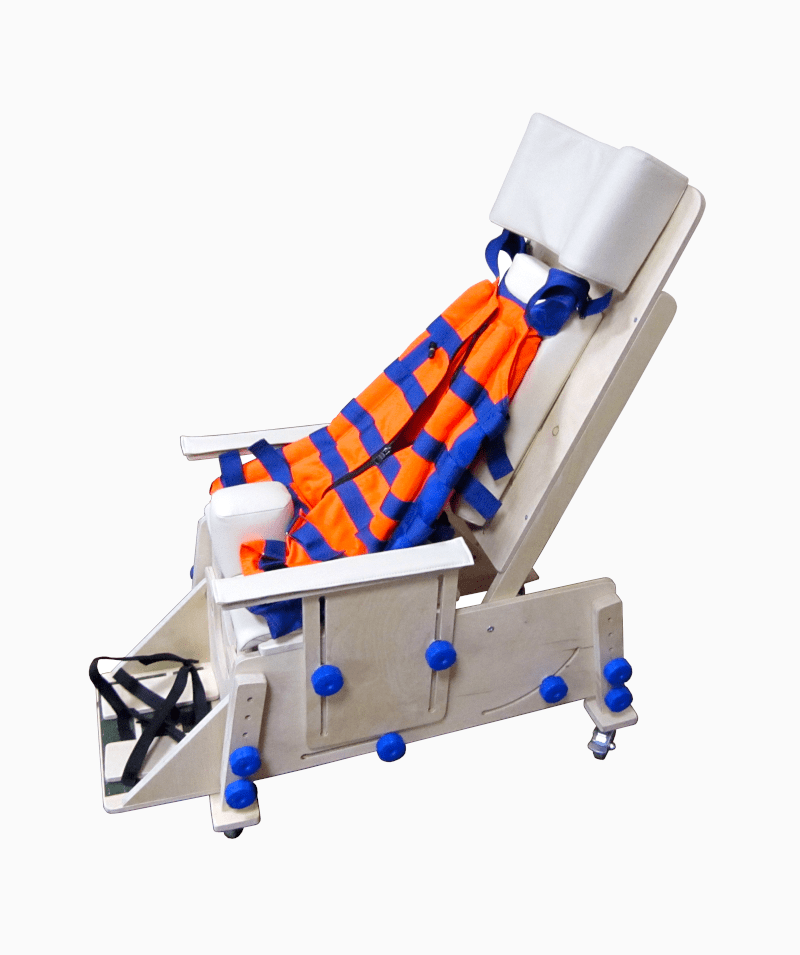 Опора может изготавливаться с анатомической спинкой, подголовником и жилетом для детей с ослабленными мышцами спины, сколиозом, нарушением осанки и отсутствие контроля положения торса.