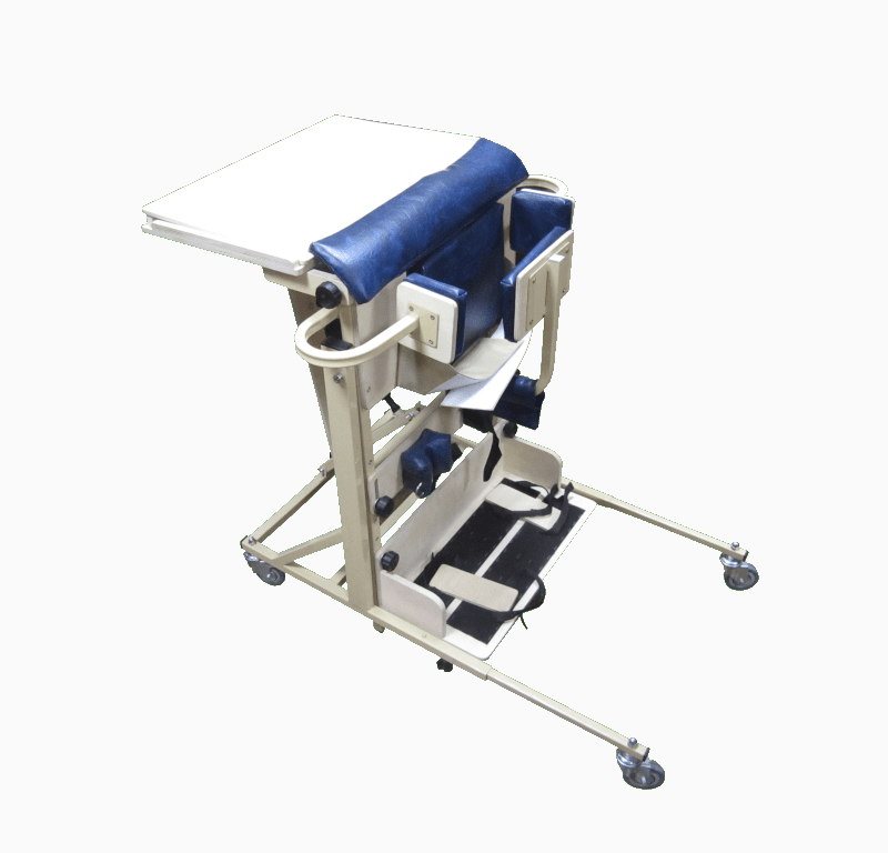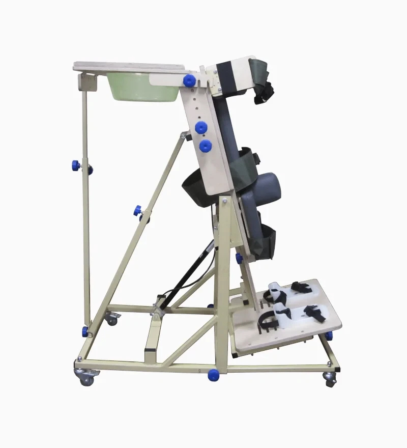Описание: Опора конструктивно позволяет находиться пациенту в наклонном положении от горизонтального до вертикального, т. е. поворот стола осуществляется на 90 градусов с жестким закреплением определенного положения. Всего фиксируемых положений – 11. Ребенок фиксируется крепежными приспособлениями в четырех местах: закрепляются стопы, колени, тазобедренный и грудной отдел. Такое надежное крепление, которое ощущает ребенок, сводит к минимуму чувство дискомфорта, возникающее у него при переводе из привычного лежачего положения, постепенно увеличивая угол наклона, и в вертикальное. При этом происходит поэтапное и плавное уменьшение дополнительной опоры ребенку. Голова ребенка, при необходимости, может фиксироваться подголовниками.
