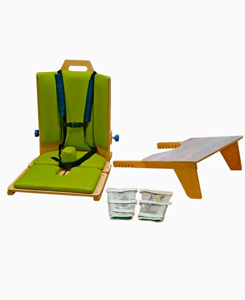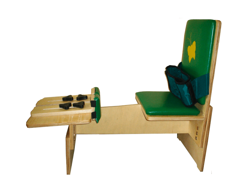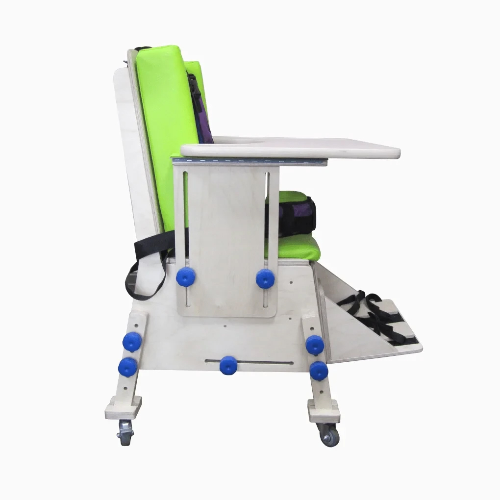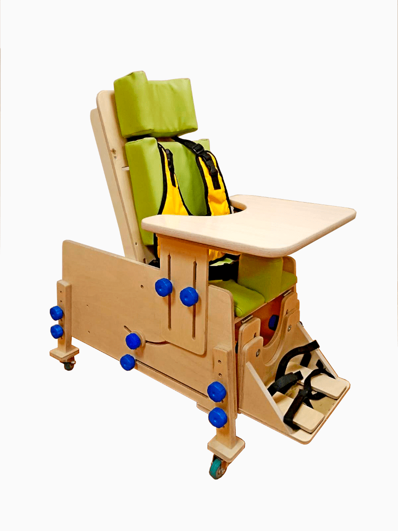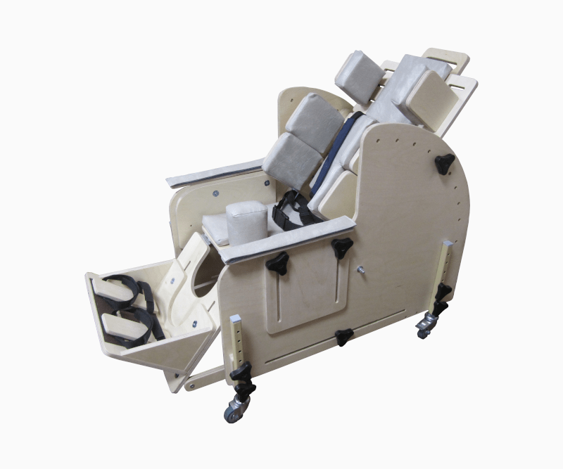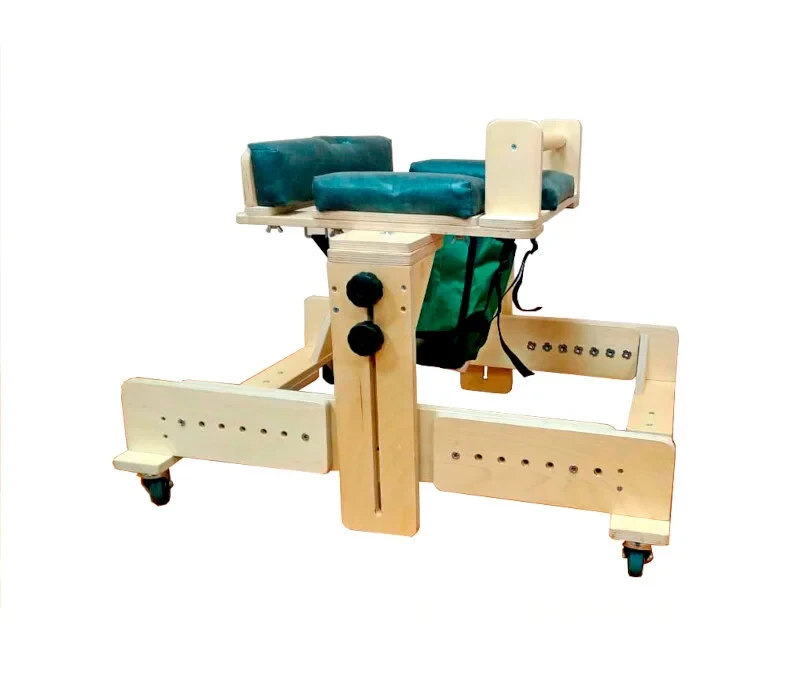 Посредством регулировки опора складывается в сидение со спинкой, подножкой, столиком и ортопедической укладкой. Преимуществом данного сидения является то, что спинка и сидушка могут находится под различным углом друг к другу. Приподнятое сидение необходимо для позы эмбриона при патологических переразгибаниях торса, а наклонная назад спинка опоры позволяет корректировать положение головы. Стопы и голени фиксируются в трех различных положениях опоры, что позволяет добиваться лучшего реабилитационного эффекта. Установка столика для рук дает возможность проводить занятия на развитие мелкой моторики и речи, а ребенок чувствует себя в безопасности и расслабляется во время этих занятий.
