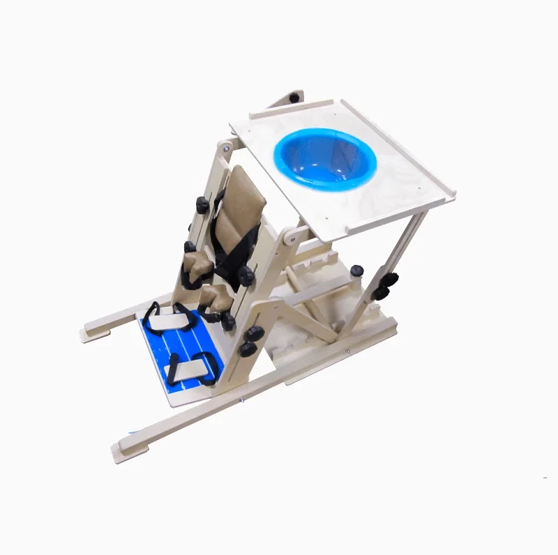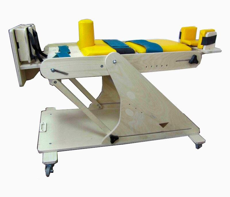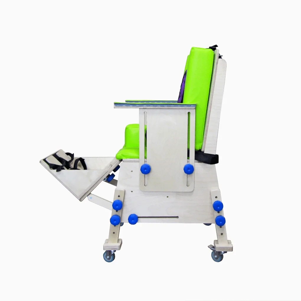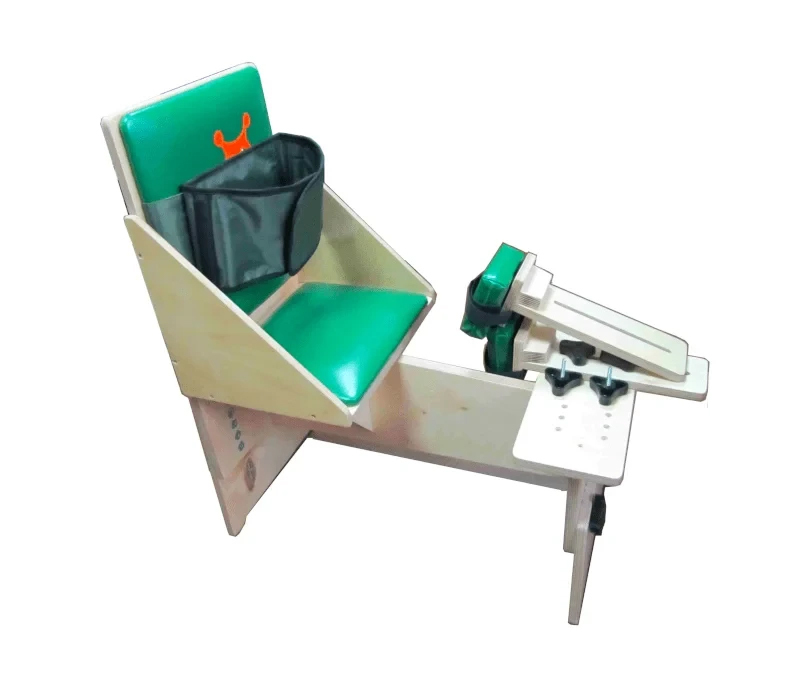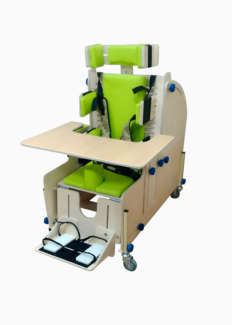 Посредством регулировки опора складывается в сидение со спинкой, подножкой, столиком и ортопедической укладкой. Преимуществом данного сидения является то, что спинка и сидушка могут находится под различным углом друг к другу. Приподнятое сидение необходимо для позы эмбриона при патологических переразгибаниях торса, а наклонная назад спинка опоры позволяет корректировать положение головы. Стопы и голени фиксируются в трех различных положениях опоры, что позволяет добиваться лучшего реабилитационного эффекта. Установка столика для рук дает возможность проводить занятия на развитие мелкой моторики и речи, а ребенок чувствует себя в безопасности и расслабляется во время этих занятий.