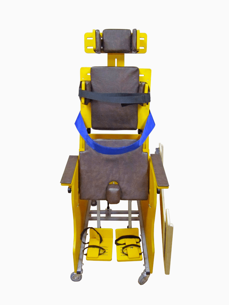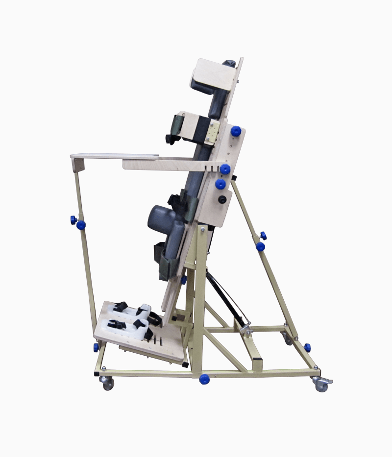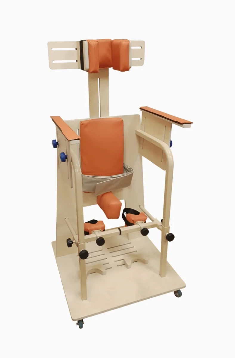 Описание: Для пациентов, не умеющих стоять без опоры. Фиксирование пациента только в вертикальном положении. Крепление в 4-х местах: стопы, колени, тазобедренный и грудной отделы. Основной функциональный размер опорной рамы, по которому она подбирается для пациента – это расстояние от подножки до столешницы, отвечающее расстоянию от подошвы от подмышек ребёнка. Для жесткой фиксации стоп сандалии с крепежными ремешками (крепления для стоп) устанавливаются в нужное положение на подножке и фиксируются на липучке (прижать с небольшим усилием). Изменяется высота столика, высота наколенников и расстояние между ними. Крепление тазобедренного пояса, представляющее собой широкий ремень из кожи, крепится к стойкам рамы на липучках.