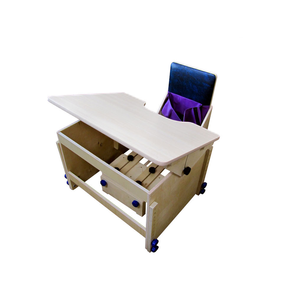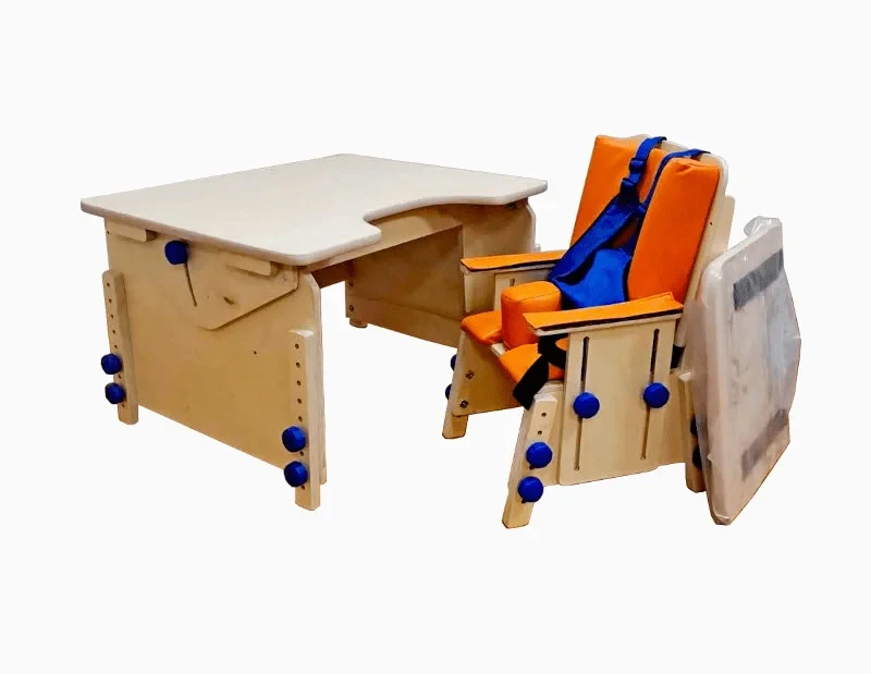 Абдукционный валик (сидение) может регулироваться по высоте. К креслу прилагается стол, который может быть адаптирован фиксаторами для рук. Столик служит дополнительной опорой для рук и помогает развитию мелкой моторики. Стол-парту можно регулировать по высоте, это дает возможность создать индивидуальную комфортность и применение