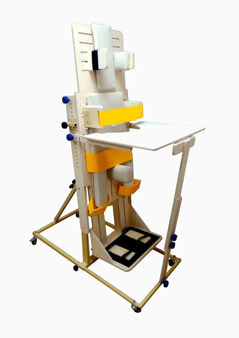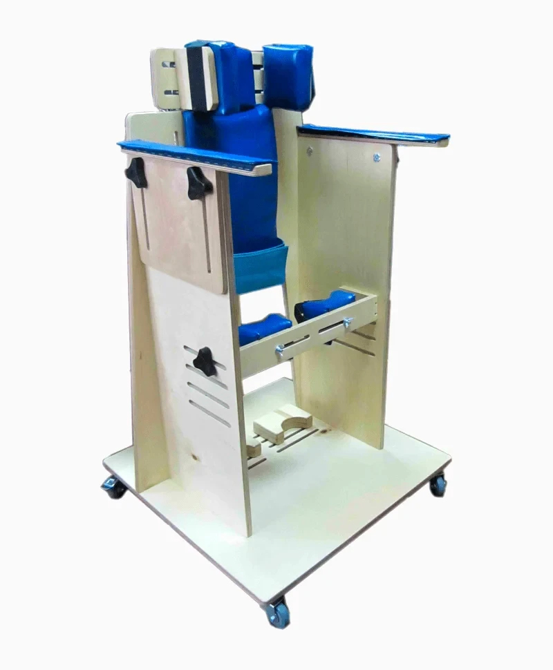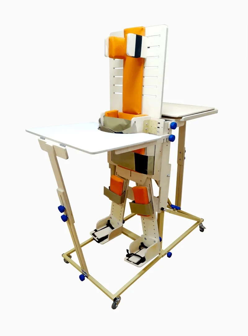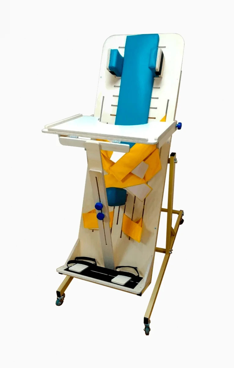 Описание: Используется как для обучения ребёнка положению стоя, для фиксации пользователя в вертикальном положении, тренировки устойчивости осанки пользователя в вертикальном положении, так и для обучения ходьбе. Устранение контрактур в тазобедренных и коленных суставах, стопах, переразгибания торса. Спинка снабжена спинодержателем, установленным с возможностью движения по вертикали. К спинодержателю прикреплен подголовник с боковинами. Ширина подголовника может регулироваться. Подголовник ставится на тот уровень, на котором необходимо зафиксировать ребёнка, чтобы избежать переразгибания (патологический рефлекс). Подголовник может выполнять функцию спинодержателя для предупреждения заваливания вбок и поддержания туловища в правильном положении. Для устранения перекреста ног между между продольными ножками установлена распорка в виде двух продольных реек. Перед ребенком на раме на уровне груди крепится столик для занятий. Столик служит также для опоры и уменьшения спастики рук, что в дальнейшем приводит к расслаблению мышц ног. Столик также служит для подготовки мышц рук для упора на поручни. Вспомогательными элементами являются «штанишки», с застежками по бокам. Опора установлена на колеса, задняя пара которых имеет тормоза.