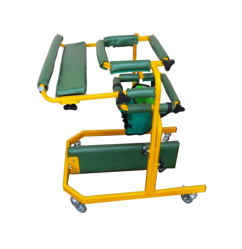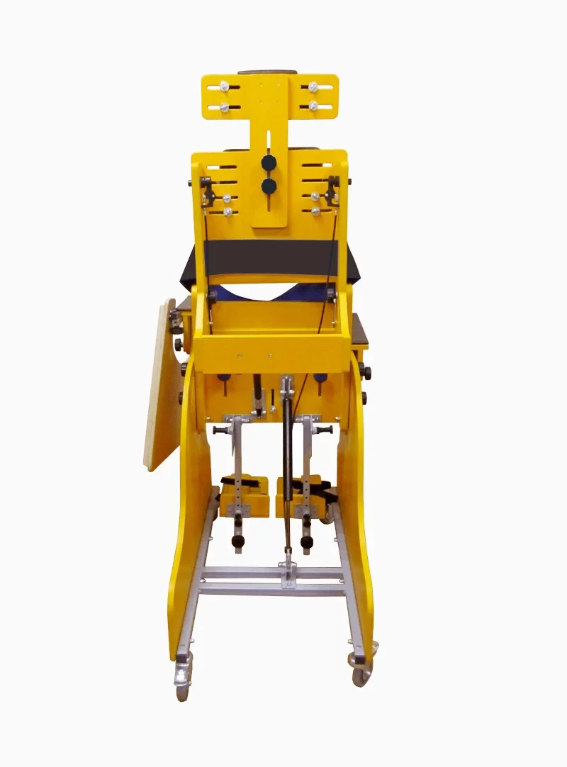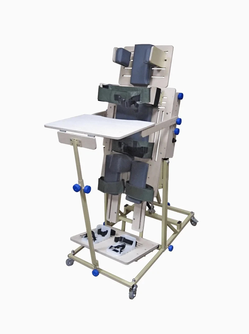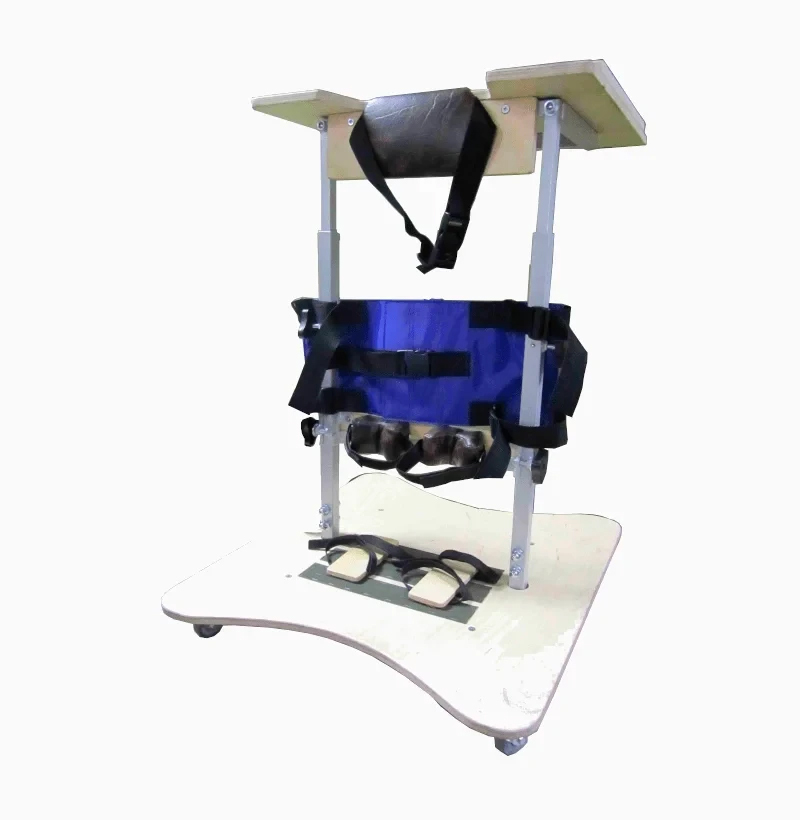 Описание: Используется как для обучения ребёнка положению стоя, для фиксации пользователя в вертикальном положении, тренировки устойчивости осанки пользователя в вертикальном положении, так и для обучения ходьбе. Устранение контрактур в тазобедренных и коленных суставах, стопах, переразгибания торса. Спинка снабжена спинодержателем, установленным с возможностью движения по вертикали. К спинодержателю прикреплен подголовник с боковинами. Ширина подголовника может регулироваться. Подголовник ставится на тот уровень, на котором необходимо зафиксировать ребёнка, чтобы избежать переразгибания (патологический рефлекс). Подголовник может выполнять функцию спинодержателя для предупреждения заваливания вбок и поддержания туловища в правильном положении. Для устранения перекреста ног между между продольными ножками установлена распорка в виде двух продольных реек. Перед ребенком на раме на уровне груди крепится столик для занятий. Столик служит также для опоры и уменьшения спастики рук, что в дальнейшем приводит к расслаблению мышц ног. Столик также служит для подготовки мышц рук для упора на поручни. Вспомогательными элементами являются «штанишки», с застежками по бокам. Опора установлена на колеса, задняя пара которых имеет тормоза.