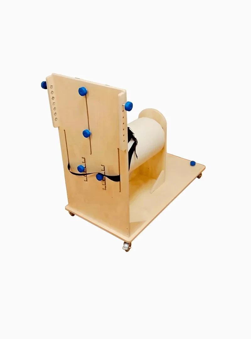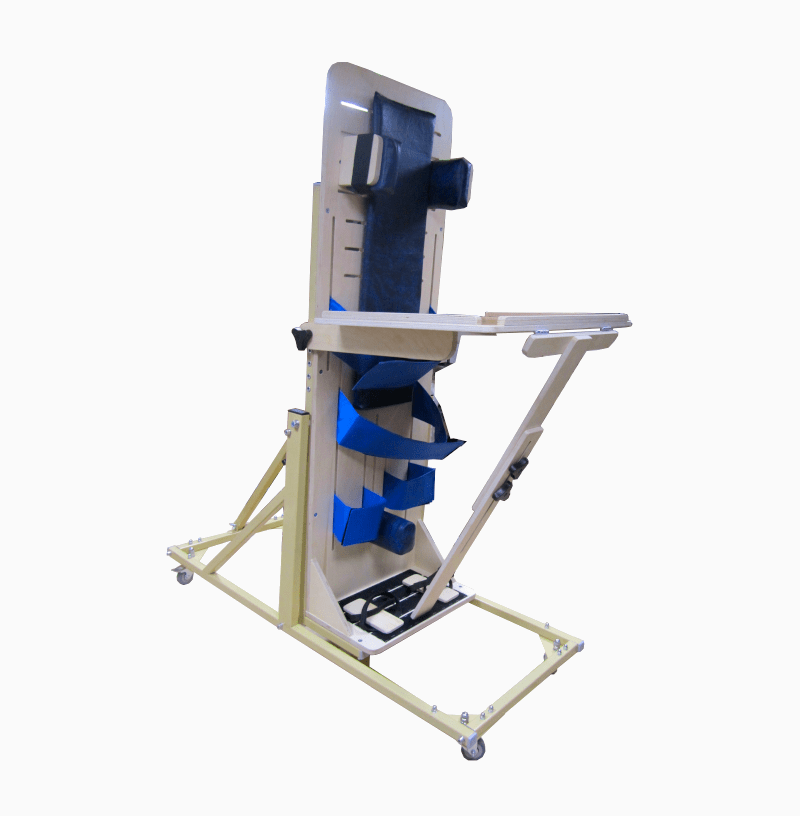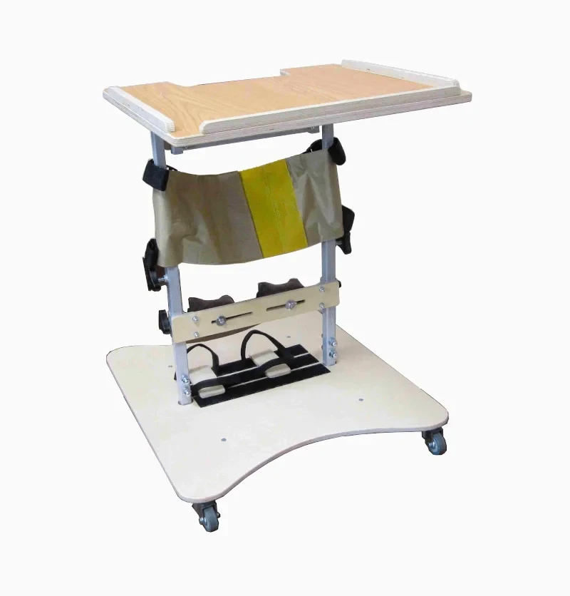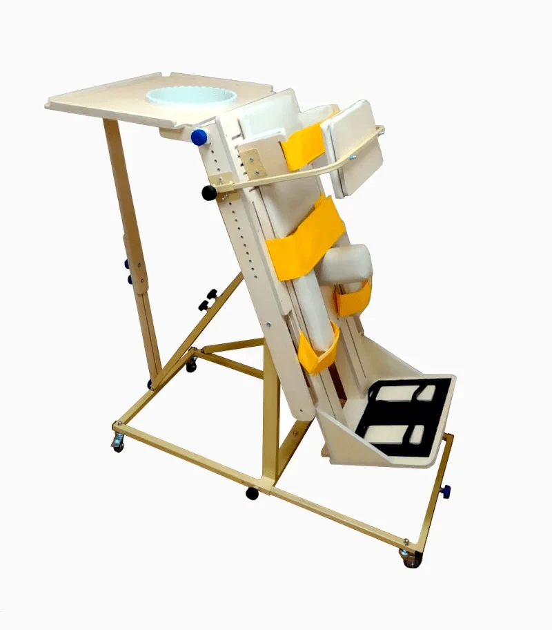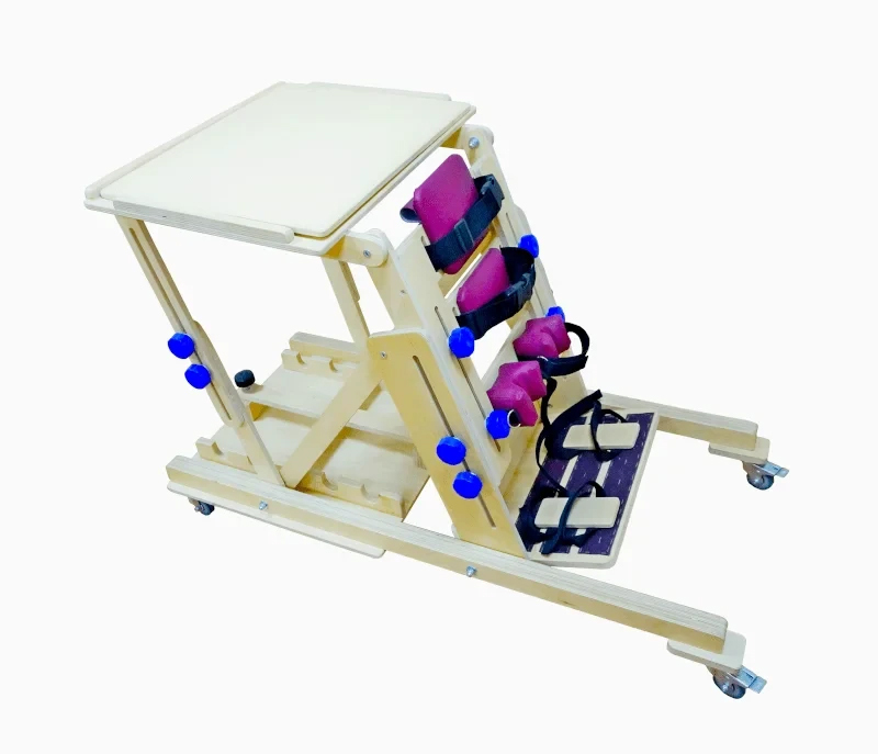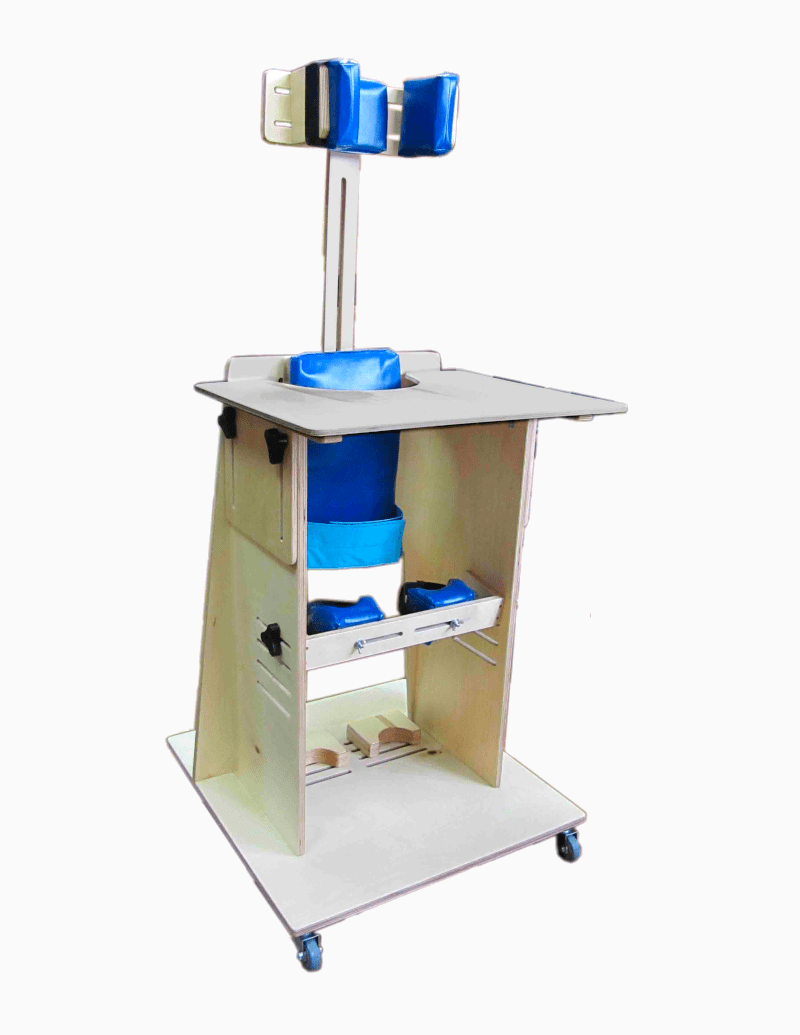 Перед ребенком на раме на уровне груди крепится столик для занятий. Для детей с более устойчивой осанкой можно использовать упрощенный вариант без столика, где ребенок в раме-стойке может стоять около простого стола, раковины или окна.
