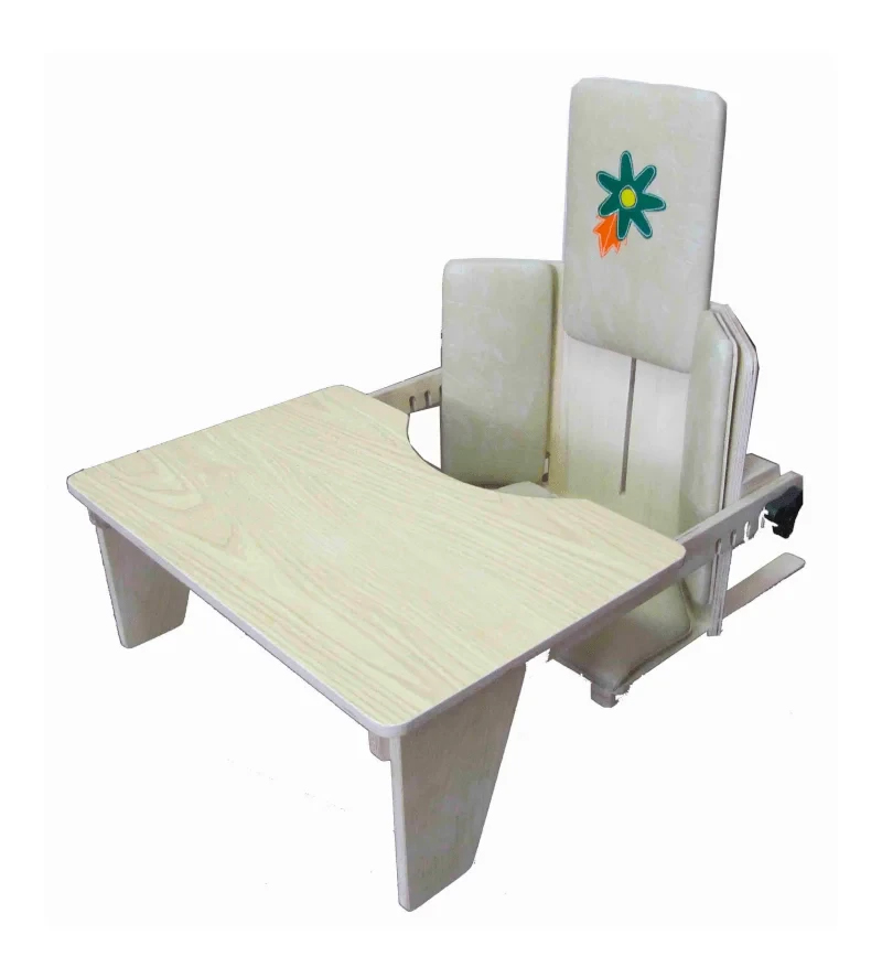 Перед ребенком, на уровне груди, расположен столик для занятий. Столешница съемная, вместо нее может устанавливаться ванночка, позволяя играть ребенку с водой и плавающими игрушками, что расширяет сферу его ощущений, стимулируя умственное развитие.