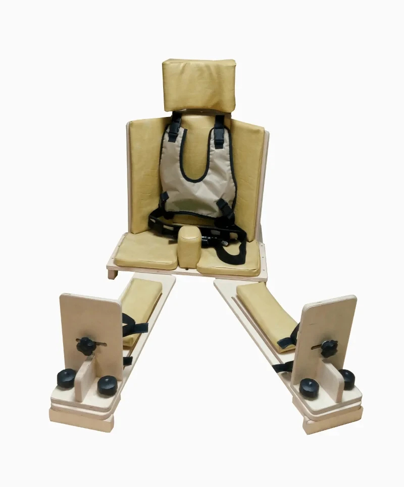 Дополнительно установленная платформа, позволяет ребенку сидеть правильно по-турецки (абдуктор за ногами) или с прямыми ногами (абдуктор в виде ортопедической распорки).
