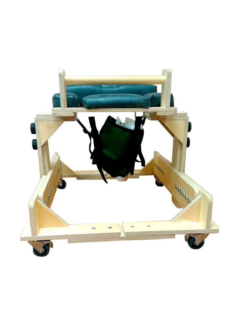 Опора установлена на колесах, задняя пара колес имеет тормоза. Опора регулируется по ширине, длине и высоте, что облегчает обслуживание и не требует дополнительного персонала для регулирования. Предусмотрена регулировка ширины мягких подлокотников на уровне торса. На грудном уровне предусмотрен поручень для удержания равновесия при гиперкинезах. Задняя спинка (спиноупор) открывается, что позволяет, не поднимая ребенка, помещать и фиксировать его в опоре. Опора может быть снабжена столиком и перекладиной между ног. Рекомендуется применять до того, как ребенок сам сможет устойчиво держаться и управлять облегченными ходунками.